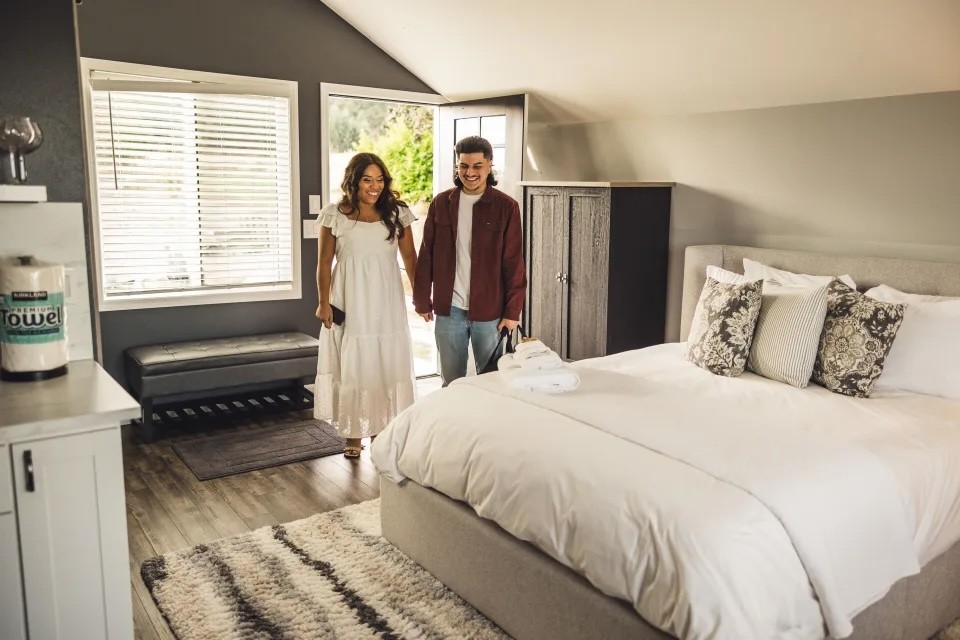 Perfectly positioned in the heart of the Eola-Amity Hills, the Barn Cottage places you among some of the Willamette Valley’s most scenic vineyards and acclaimed wineries. Enjoy a tasting at nearby Bryn Mawr, Bethel Heights, or Cristom Vineyards, explore local favorites in the charming town of Amity, just minutes away. With Salem, McMinnville, and the Oregon Coast all within easy reach, this tranquil hillside retreat offers the perfect balance of seclusion and accessibility in Oregon Wine Country. Inside, the studio combines rustic charm with quiet sophistication. A queen memory foam bed dressed in luxurious linens invites deep, restorative rest, while large windows frame views of Mount Hood and the LaLa block of Pommard vines below. The full bathroom features a rejuvenating shower with an on-demand water heater and plush towels for added comfort. The well-equipped kitchenette makes it easy to prepare light meals or pair small bites with your favorite bottle from the day’s tastings.