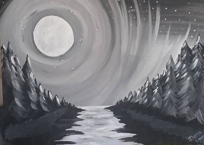 FUN Paint-Party for Adults 21+ - No experience required - All supplies included - Painting "Moon River" a landscape with Black, White and multiple shades of Grey - Use Website Link for More Info & to Register.