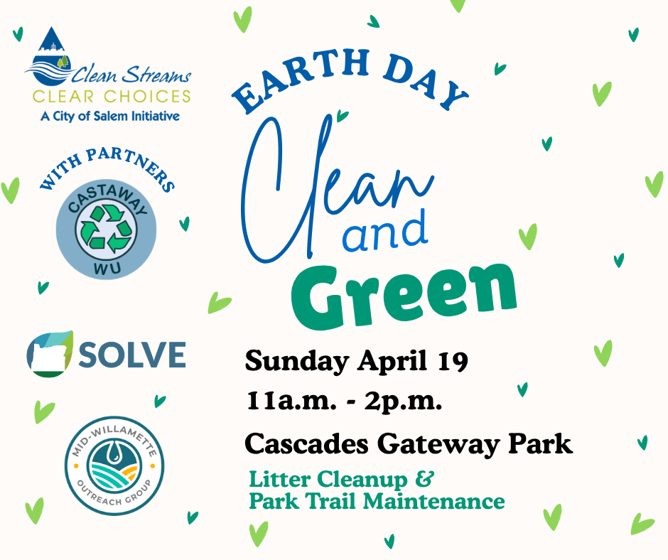Join City of Salem Clean Streams, City of Salem Parks, Mid-Willamette Outreach Group and CastawayWU for an Earth Day Clean & Green Event through SOLVE. Celebrate Earth Day by picking up litter and doing trail maintenance at Cascades Gateway Park. All supplies provided. Registration required. Youth under 18 need a parent/guardian signature on waiver. Register online.