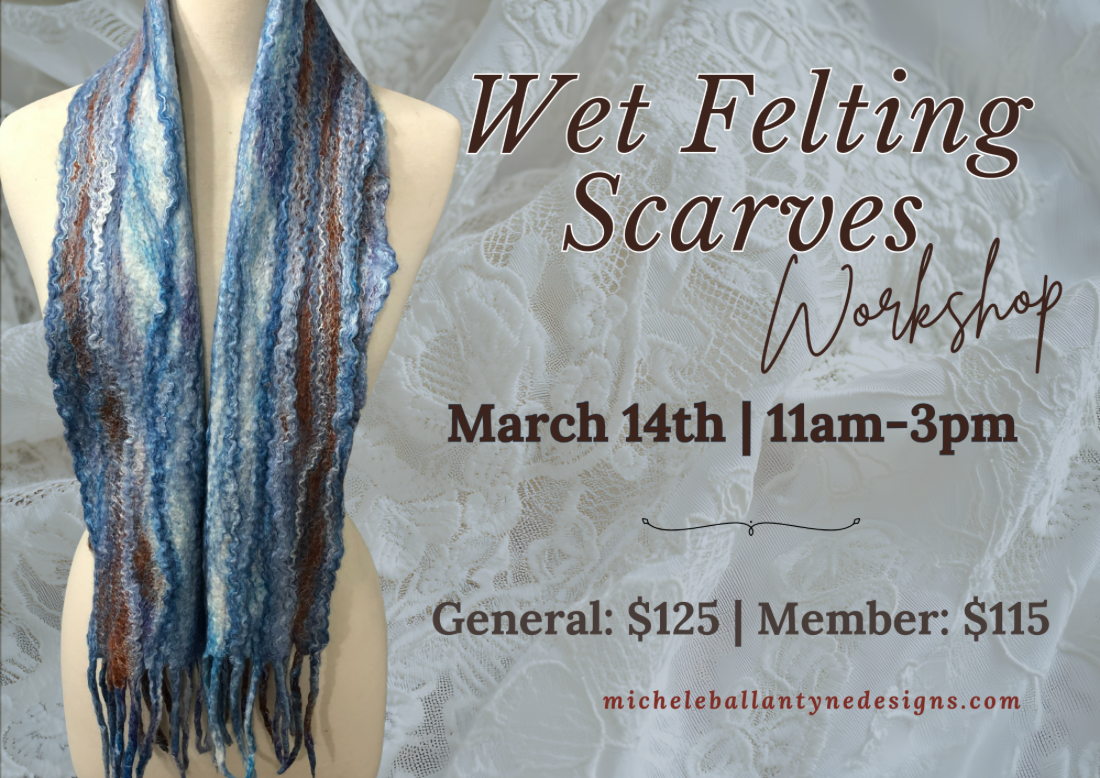 Artist Michele Ballantyne is returning to The Oregon Garden to guide you through a wet felting scarf making workshop! You will get to create one multi-colored scarf up to 10 in. wide x 6 ft long that will keep you warm and stylish during the transition between Winter to Spring!