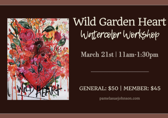 Artist Pamela Sue Johnson will guide you step by step in making a unique and expressive artwork. No drawing or painting experience needed. This workshop is suitable for beginners as well as seasoned art makers. Pamela will show you the techniques of her stylized approach to watercolor painting and how you can make your own wild garden heart artwork. Participants will be provided professional grade paints and all supplies needed to make a vibrant painting on 9×12 Cold press watercolor paper.