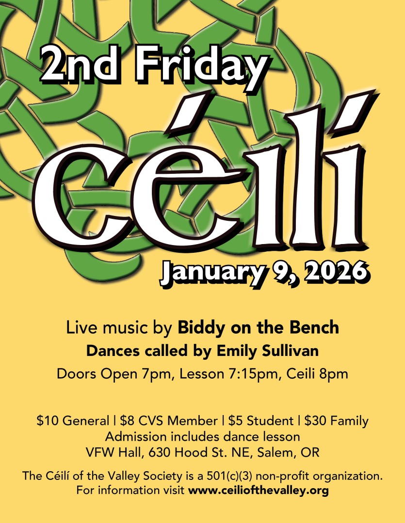 Come to the second Friday Ceili to hear great Celtic music by Biddy on the Bench! Emily Sullivan will be the caller. Dancing is not required. Come listen to the music! Doors open at 7 with a short dance lesson at 7:15. Live music is from 8 to 11. No partner or experience is needed. Beginners come monthly. Wear comfortable shoes suitable for easy movement. Tennis shoes are fine. Our goal is always to have fun! Bring water; light snacks will be available.